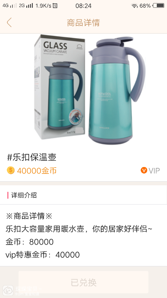 乐扣保温壶,40000金币在VIP商城兑换的。兑换这个壶的初衷是希望在停电的时候能够喝上热水,因为有次停电了喝的冷水,然后就不幸的拉肚子了。在盼望声中迎来了上新。在第一时间兑换了这个保温壶。