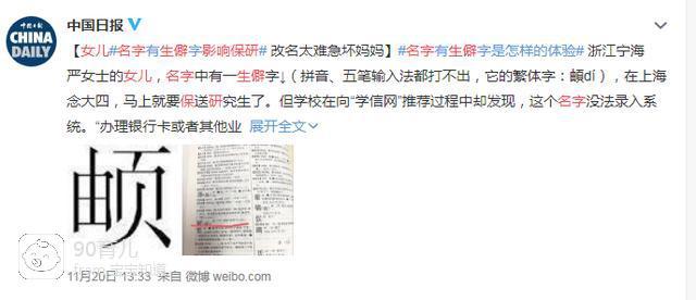 前段时间,在上海读大四的女儿就因为名字中的生僻字,耽误了保研。由于女儿成绩优异,眼看着就要保送研究生了,结果却发现,名字没有办法录入到"学信网"的系统当中。名字没办法录入,孩子便推荐不了。这可急坏了孩子的母亲。
