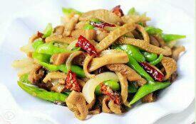 3热锅凉油,油热7成下花椒粒和辣皮子爆出香味,下羊肚翻炒2分钟