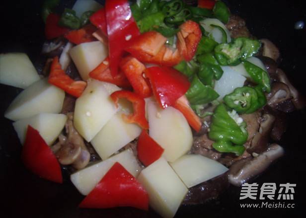 5. 炒好后,再最上面放上切好的香菇,放冰糖、花椒、香叶、大料等。