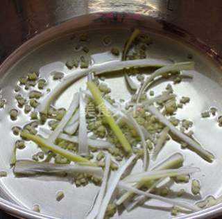 4 锅内倒入油40毫升,放入葱丝、姜末。