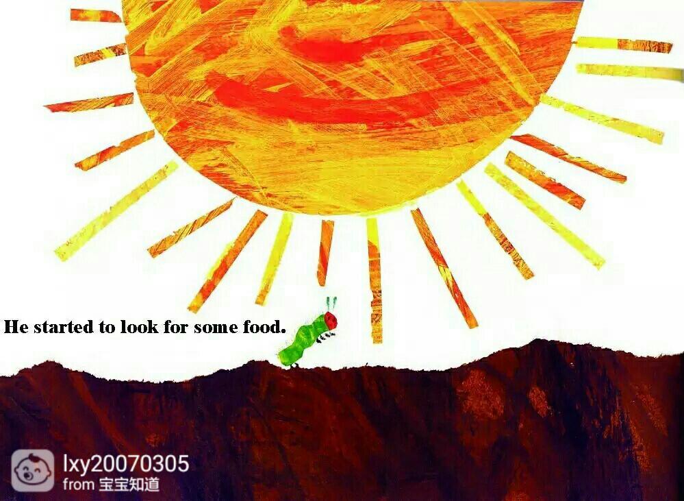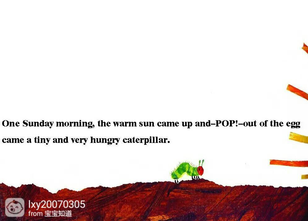 一个星期天的早上,暖和的太阳升起来了。“啵”一声,一条又小又饿的毛毛虫,从大蛋里爬了出来。(毛毛虫是不是很小很小啊,你以前也是小小的)