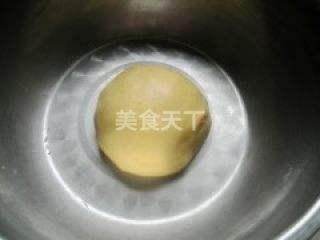 3 南瓜泥和糯米粉搅拌均匀后和成面团,盖上布饧20分钟