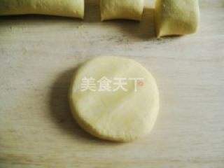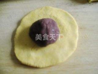 5 将面剂按扁,按薄,中间放入豆沙馅