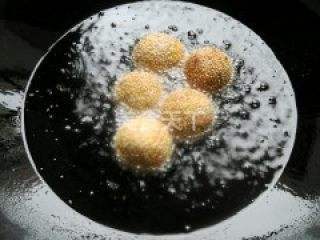 8 锅中注入油,烧6成指队热,下南瓜球进行炸制,不断的翻动南瓜球至表面金黄即可装盘