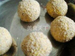 7 做好的南瓜球均匀的粘兔航锈上芝麻