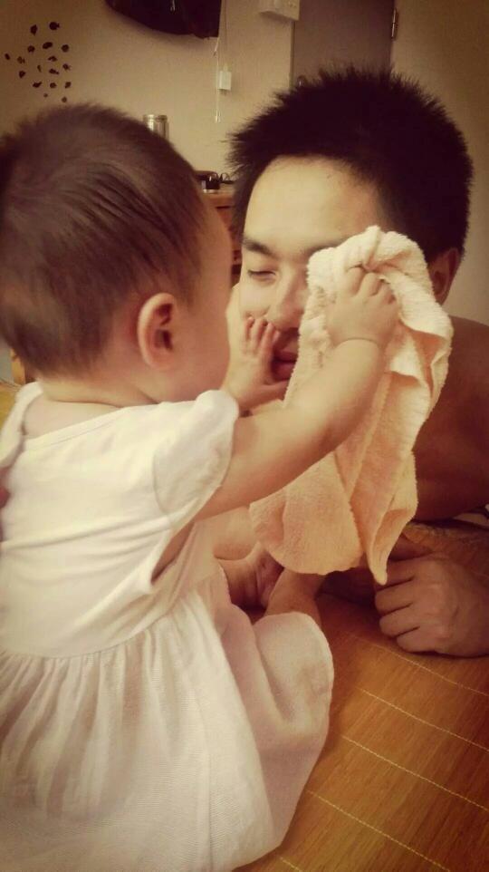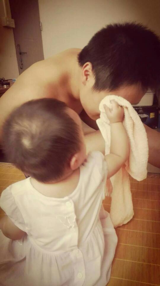 珠海的夏天真的很热,宝爸每次下班回家都会满头大汗的,他都会拿一个毛巾给自己擦擦汗。那天和往常一样,下班回家的他正拿着毛巾给自己擦汗,却被宝宝扯住了毛巾一角。看到她这样的举动,我们都很吃惊,没想到她接下来的举动更让我们吃惊,因为她拿着毛巾为宝爸擦起了汗。