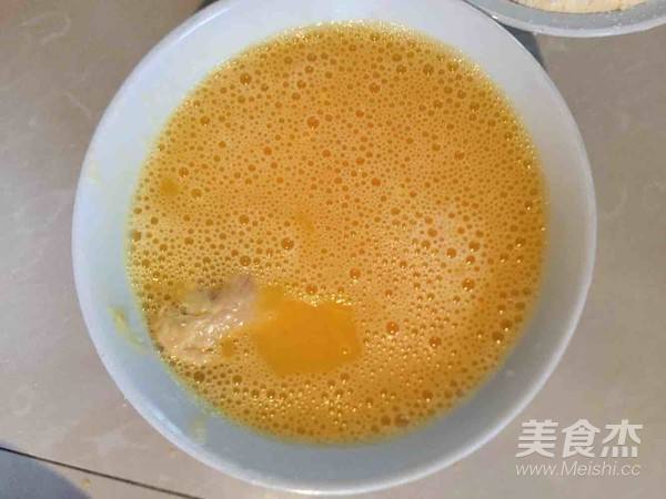 4. 鸡蛋加入等量的清水和盐打散,准备面包糠和面粉