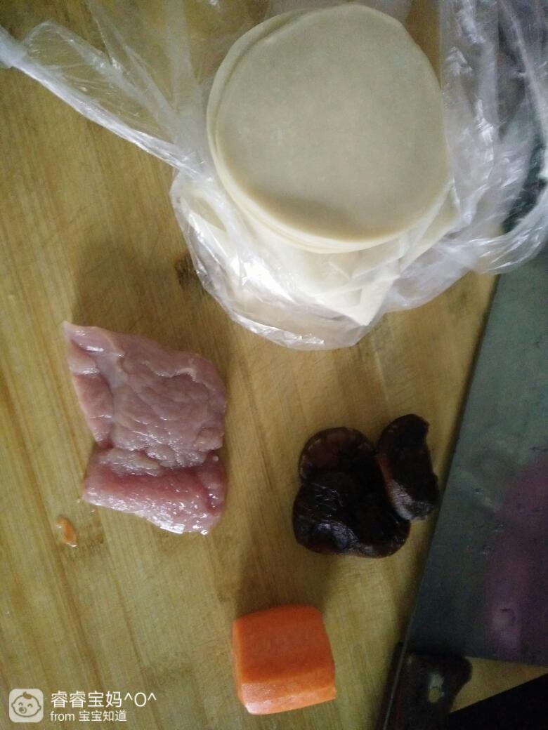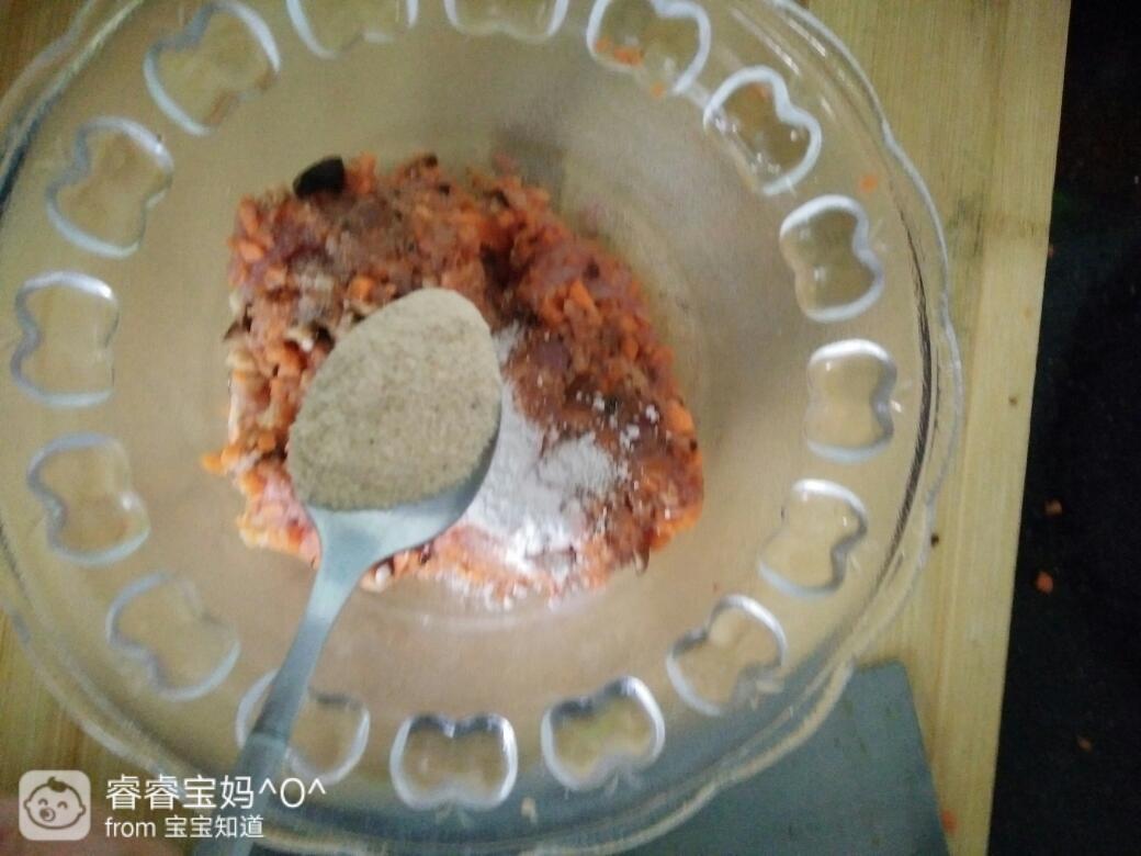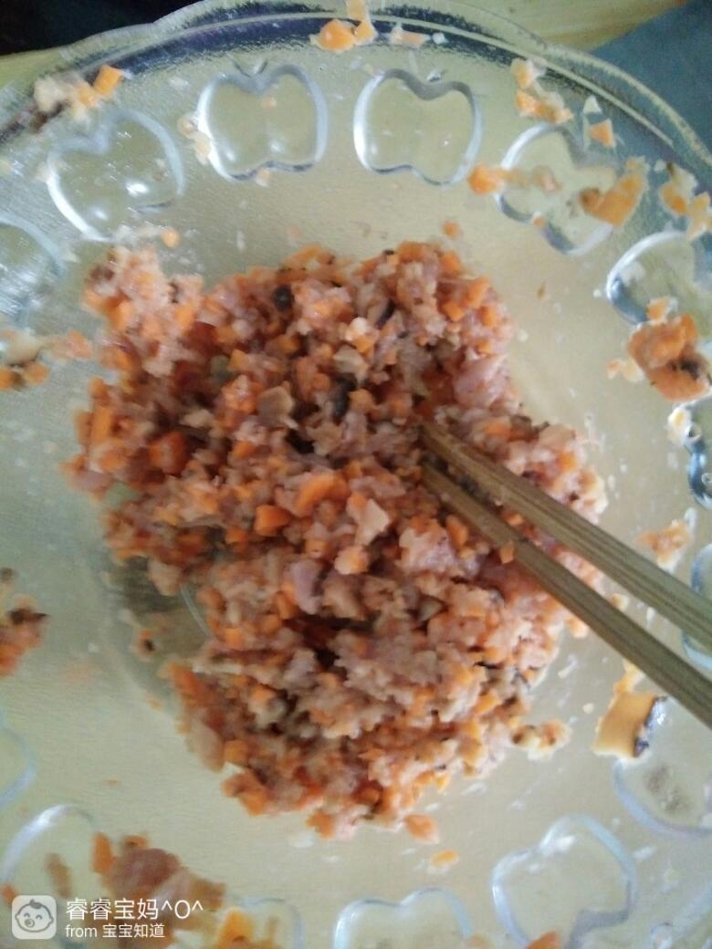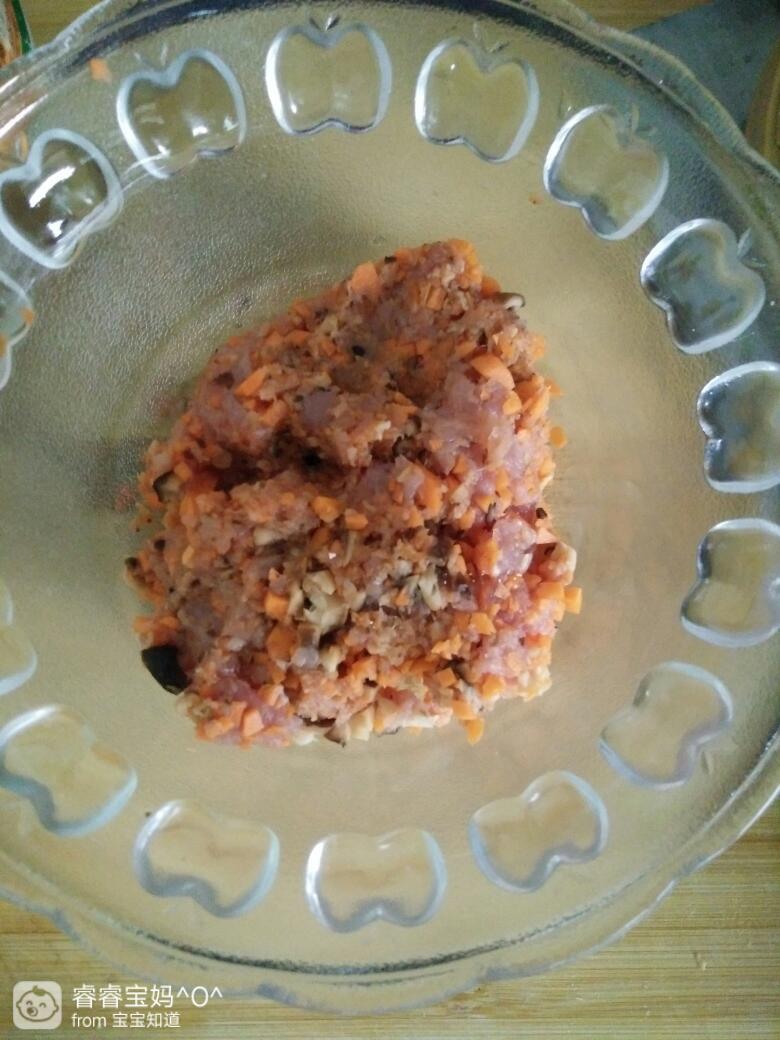把瘦肉,胡萝卜,香菇都切碎放碗里。