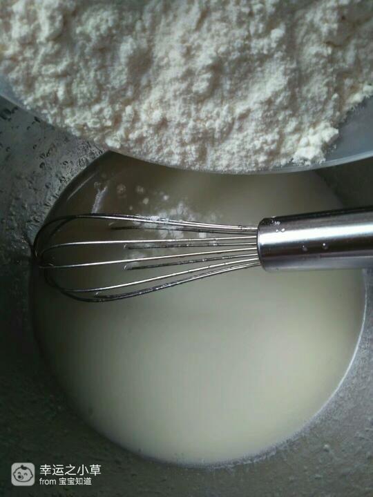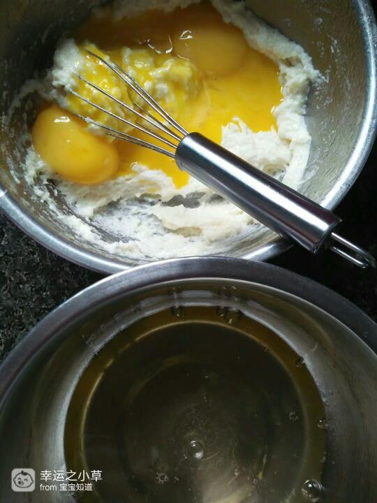 蛋清蛋黄分离,装蛋清的盆必须是无油无水的,把蛋黄打进面糊里,搅拌均匀。