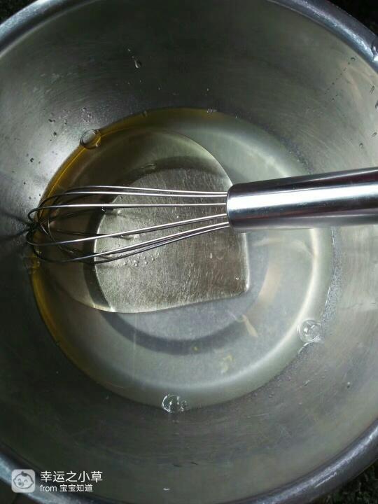 把柠檬汁,清水和油都倒在盆里,用手动打蛋器搅拌均匀,大概两分钟。