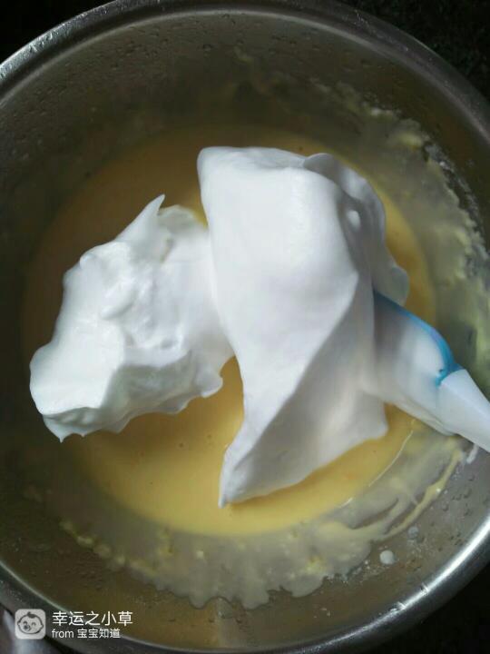 取一小部分的蛋清和蛋黄糊混岩搂抽合,用刮刀翻拌均匀,然后再倒回剩余的蛋清里,用刮刀上下翻拌均匀。