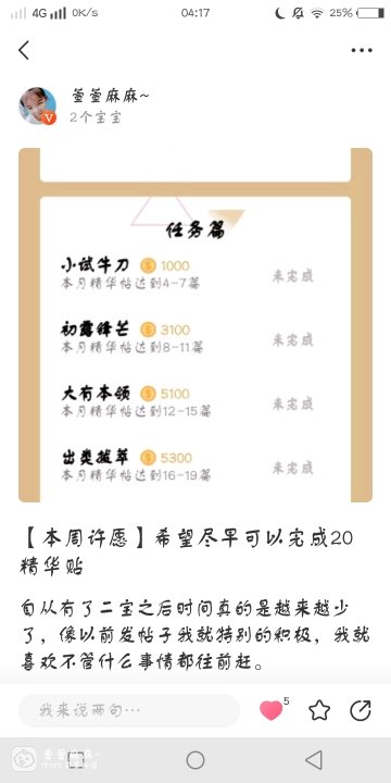其实我以前完成达人任务挺积极的,现在有了二宝,大部分时间都用来看孩子了。所以发帖有点困难。