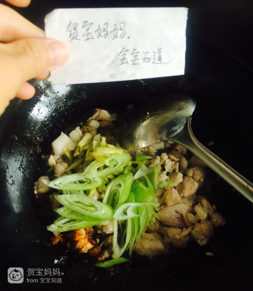 3,加入葱姜,老抽,翻炒使肉上色,葱姜爆香。