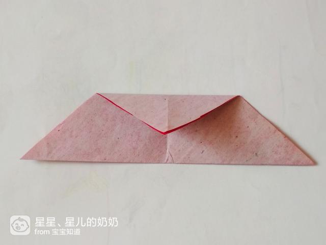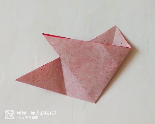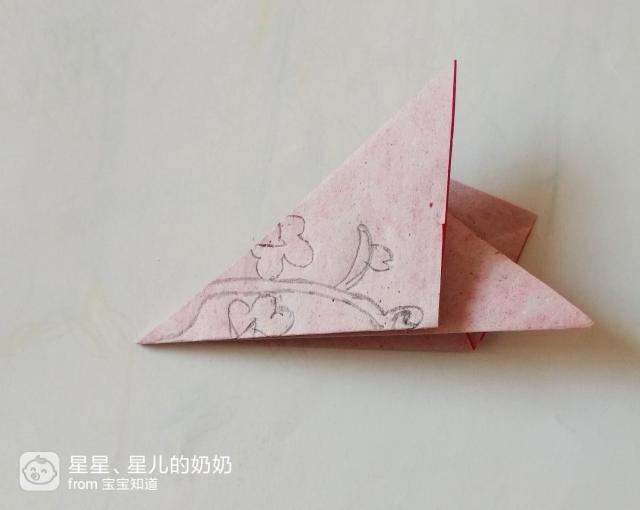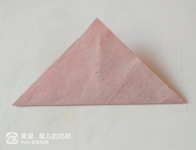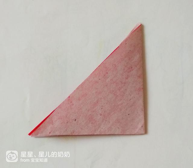 准备一张正方形的红色彩纸,将它沿对角线折成一个三角形的折纸,如图。