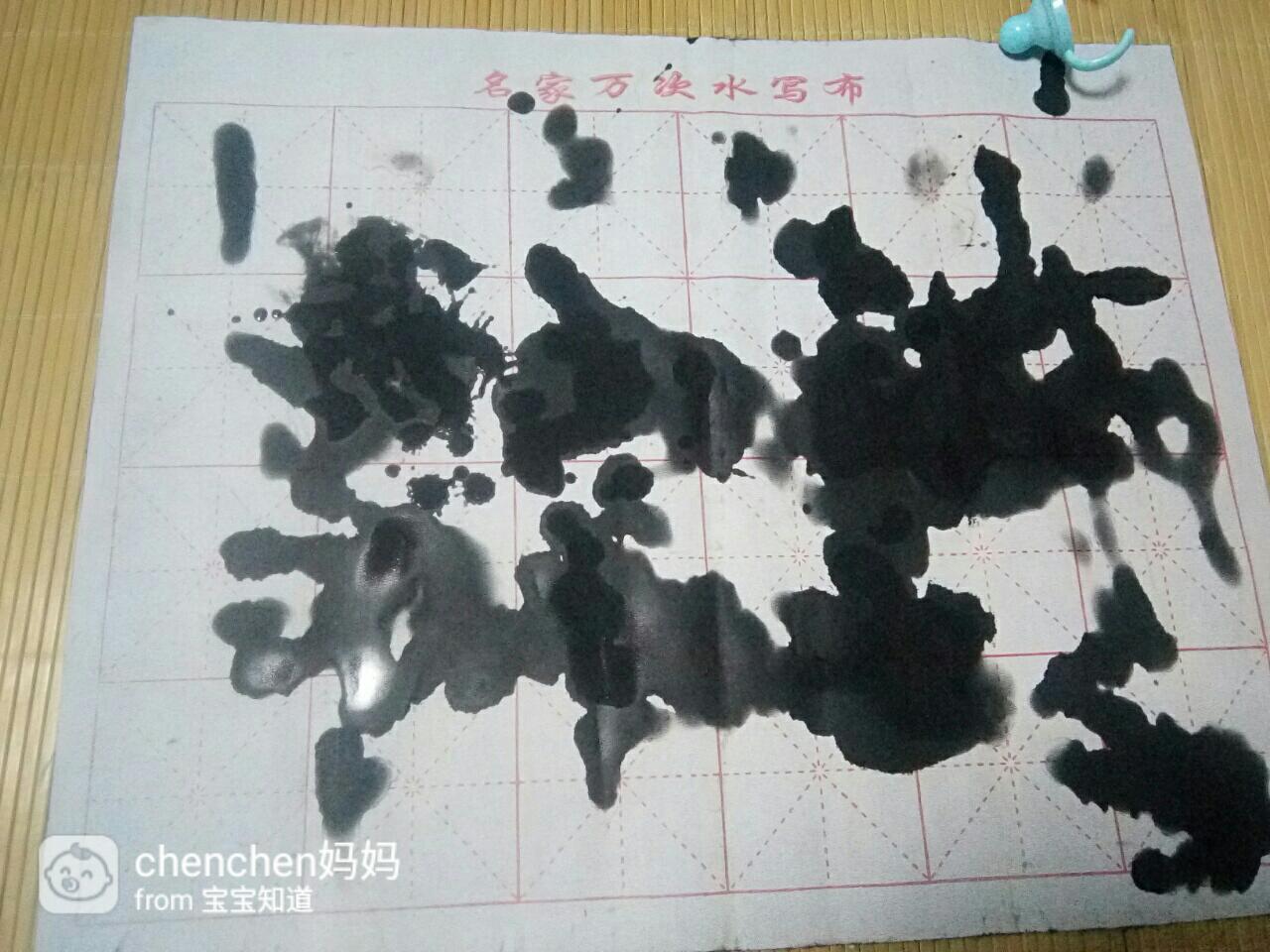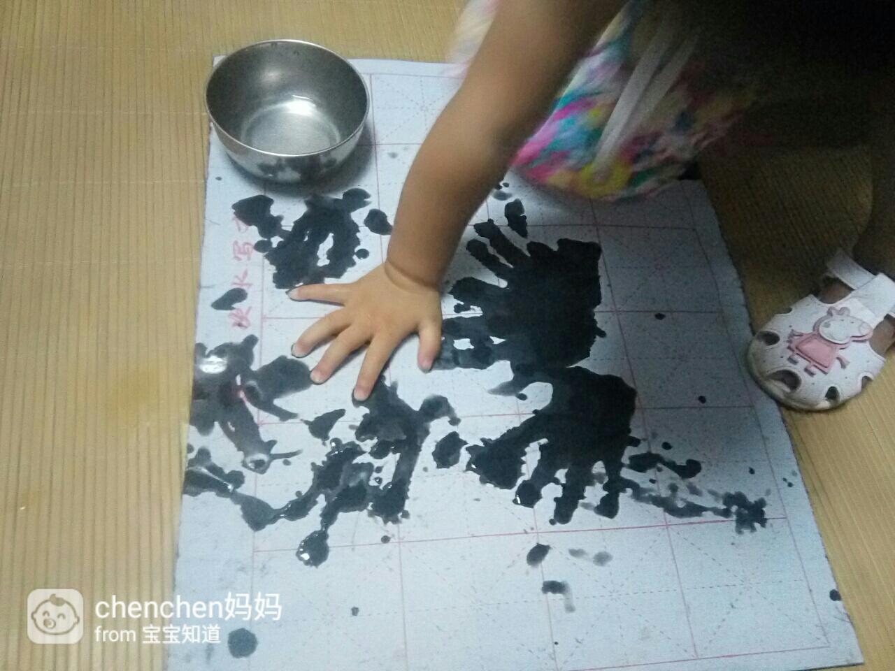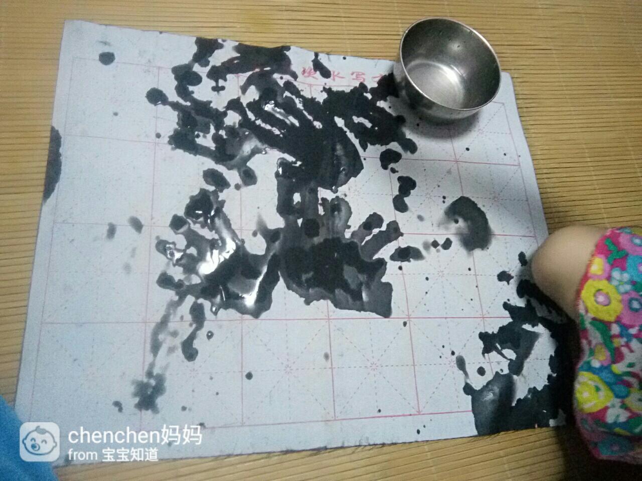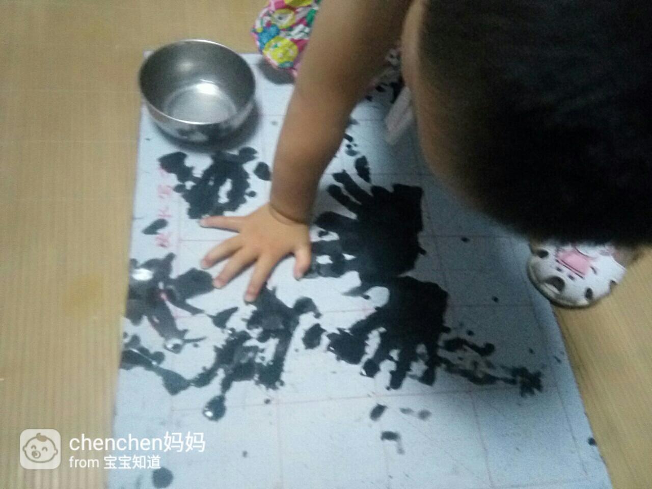 我和老公聊了一会儿后,不由得感叹现在的孩子们太幸福了,学习用品多的让人眼花缭乱,各种玩具也是应有尽有,真正进入了高科技时代,像水写布这样的学习用品,市面上大概已经找不到了吧!接着老公就用手指蘸水写了一个给在一边玩的宝宝看 ,宝宝看到后就像发现了新大陆一样开心,跑去厨房拿自己的小碗装了一碗水出来 ,用小手在上面印起了手印,就这样我们学生时代的高科技竟然沦落成了宝宝的新玩具!