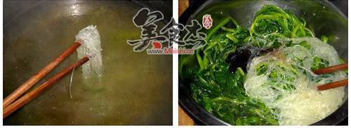 1. 菠菜切去根部,清洗干净,切段;粉丝用凉水泡软;烧一大锅水,水开后放进菠菜,加入慕急殊油、盐