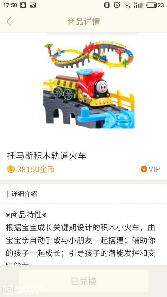 我一直觉得这个玩具挺不错的!想兑换一个给我家嘟嘟玩!看别的宝妈晒的帖子,这个玩具挺不错的!就一直惦记了!后来金币够了,也大V了!可是你却没有了!后面经常在大宝的帖子下面回复让上这个托马斯轨道火车玩具!