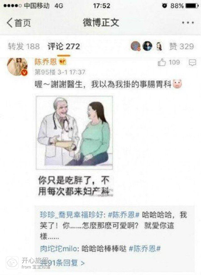 看见没,陈乔恩是个多么聪明睿智的女人呀,在微博上,用一张图诠释了自己未婚先孕的事实,不知看官有何感想,反正我是呵呵。