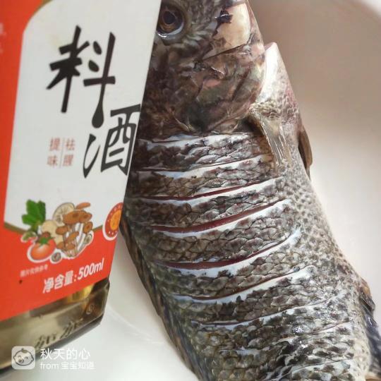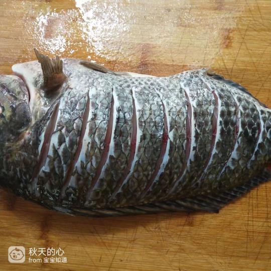 1.准备新鲜罗非鱼1尾,处理干净鱼鳞和内脏,用刀在鱼身上划几刀。