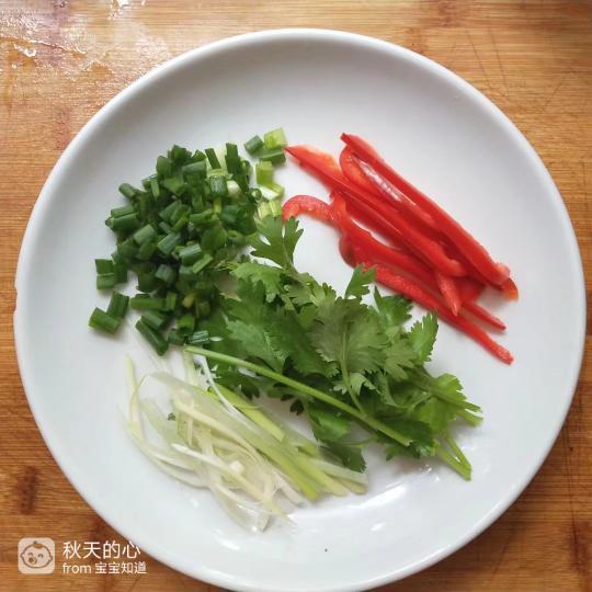 4.辣椒洗干净切丝备用,小葱洗干净,切末,葱梗切成丝备用,香菜切段备用。
