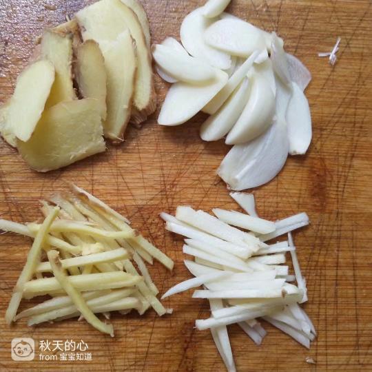 3.姜蒜一部分切片备用,一部分切丝备用。