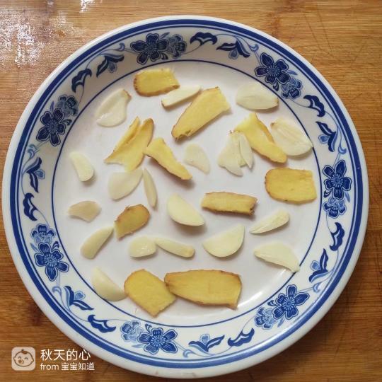 5.准备一个盘子,将姜片和大蒜片摆在盘底。