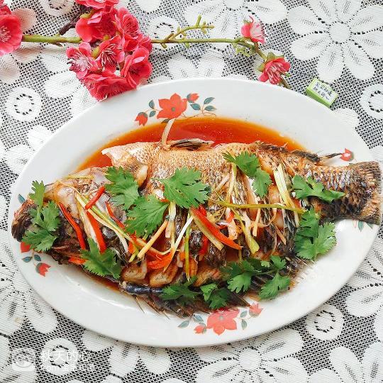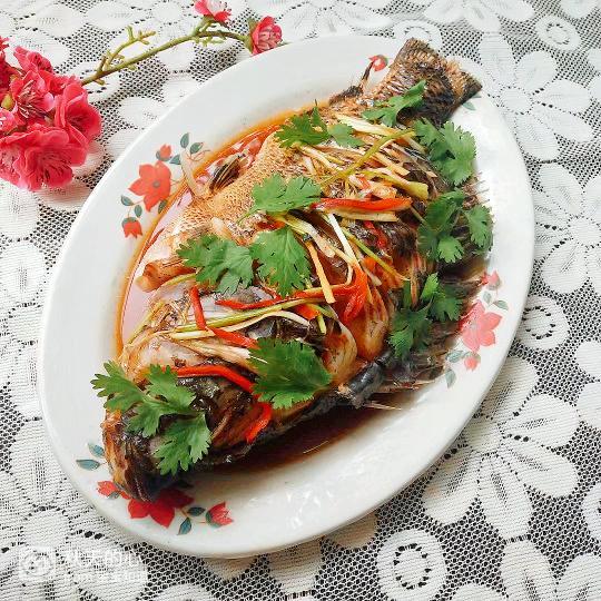 10.最后将烧开的古鼓油汁倒在蒸好的罗非鱼身上,就可以上桌了。