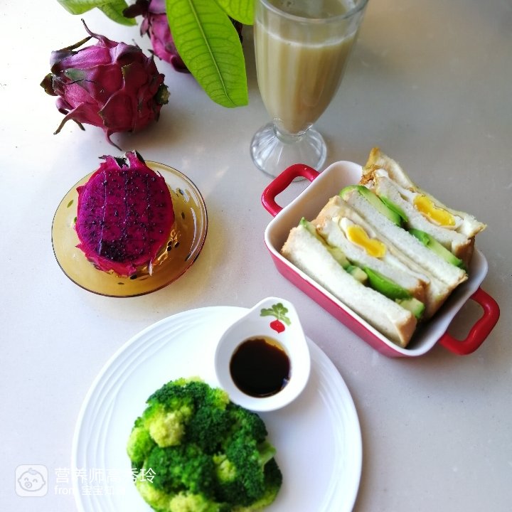#早餐打卡# 2绿豆豆浆,西兰花,鸡蛋牛油果三明治,火龙果