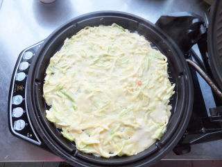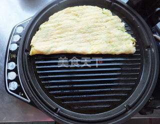 4 电饼铛用刷子刷少许油,我用的勺子一般两点裕勺子糊,摊成薄薄的。