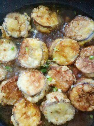 8 晾干油的茄子就可以煮了,不用放油了,放碎蒜,然后把煎好的茄子放锅里,加酱油,水焖两分钟