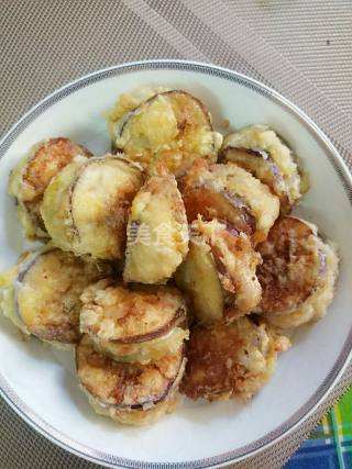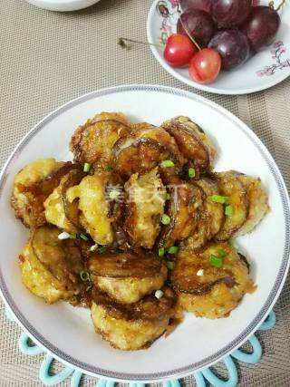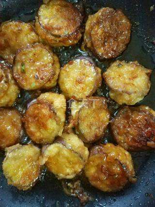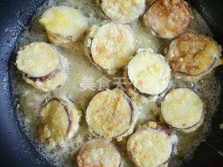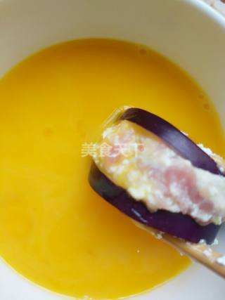 4 热锅,放油,烧至五分热,然后将茄子酿先裹鸡蛋液,