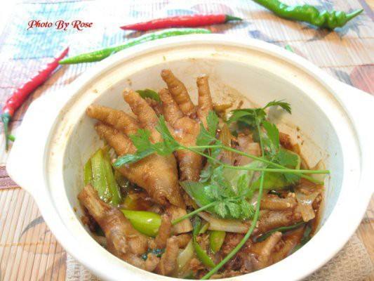 啫啫凤爪的做法 1. 瓦煲加热,锅底放油,先倒入姜茸蒜茸、红葱头、辣椒爆香,
