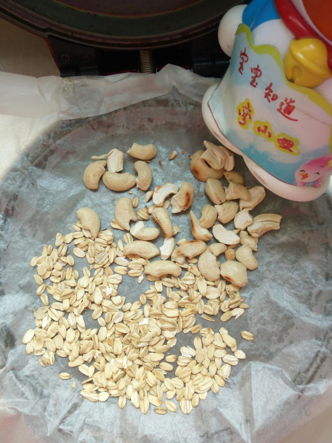腰果燕麦放到电饼铛里,铺一层油纸,烘烤一下