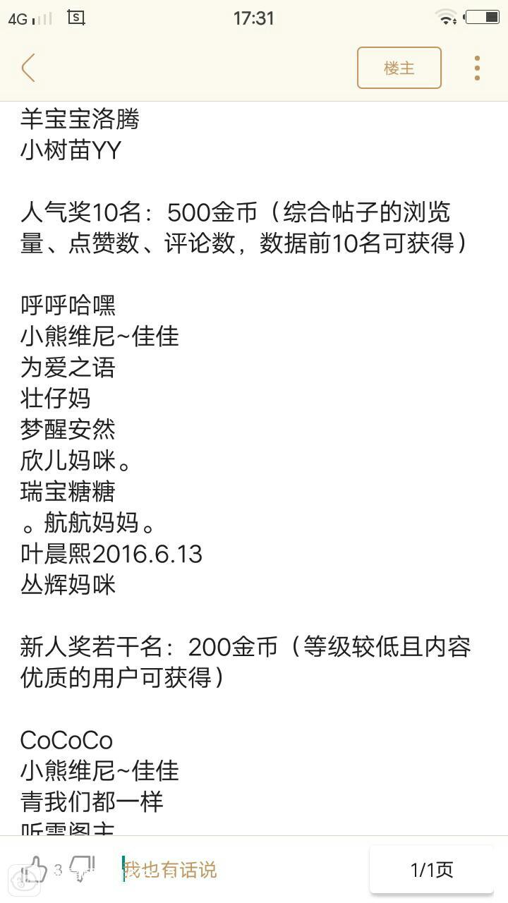 当时完全没想到我居然还能中几百金币,当某天我还在别的群和姐妹们聊天时,我偶然看到初夏的颁奖帖子。我这人有个习惯,那就是不管我有没有参加,我都喜欢看颁奖帖子,看到中奖的宝妈替她们高兴之余,也能狼射激励自己勇敢前进。