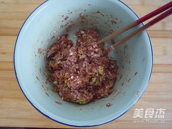 3. 肉馅中加入葱姜末、胡椒粉、食盐、料酒、酱油、食用挡倘丰油、香油搅拌均匀
