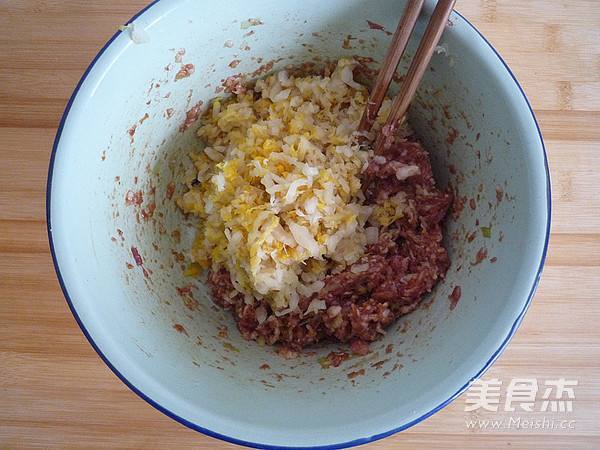 5. 切好的酸菜轻轻攥一下,挤去水分(不要太干)放入肉馅中搅拌均匀成馅料备用。