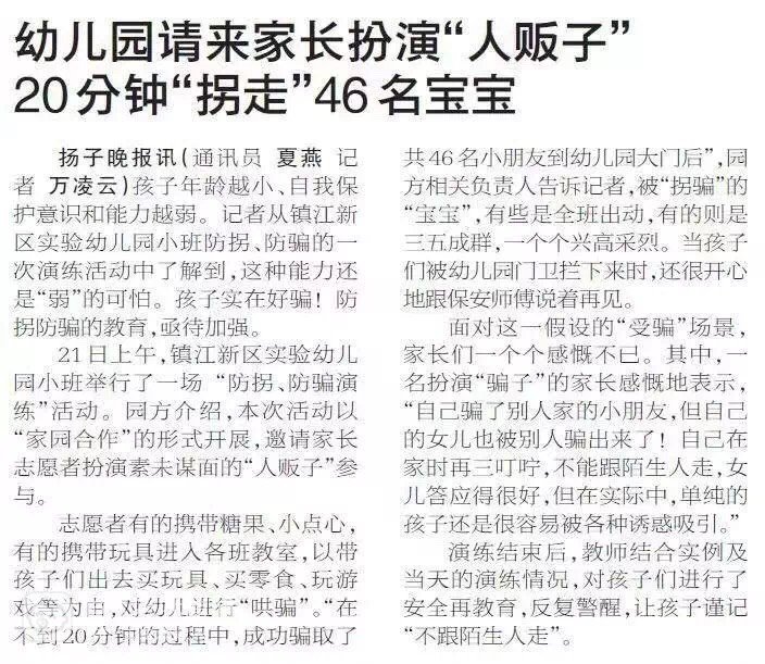 近日,江苏镇江新区实验幼儿园小班防拐、防骗的一次演练活动中了解到,孩子自我保护的,这种能力还是“弱”的可怕。