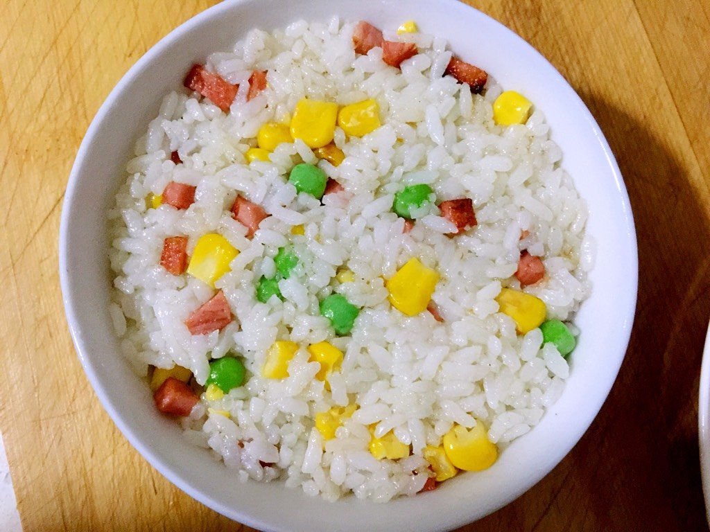 2个宝宝 LV.24米饭、玉米粒、火腿肠和一部分青豆炒熟(青豆提前煮一下)