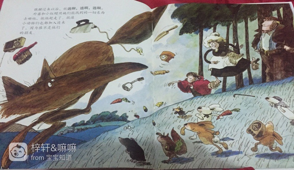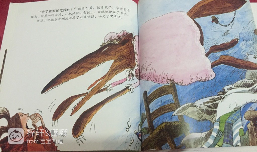 宝宝:外婆和小红帽被救出来了,是爸爸把他们从狼的嘴巴里拉出来的……