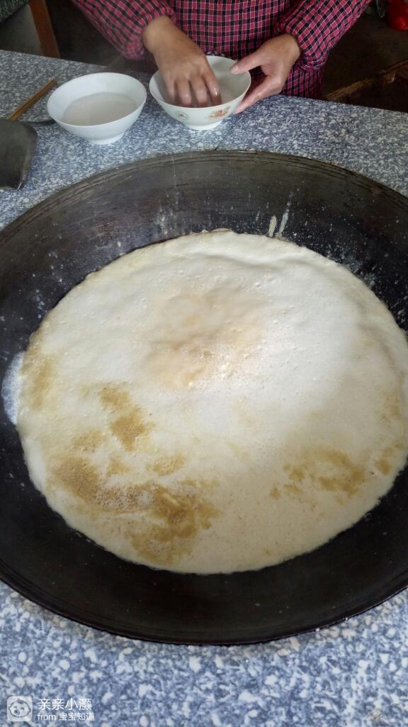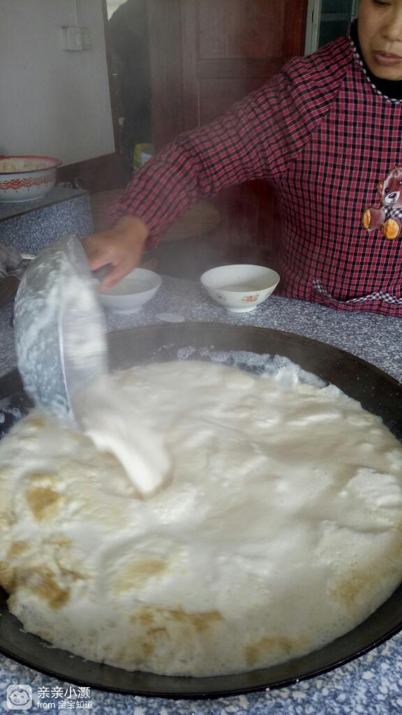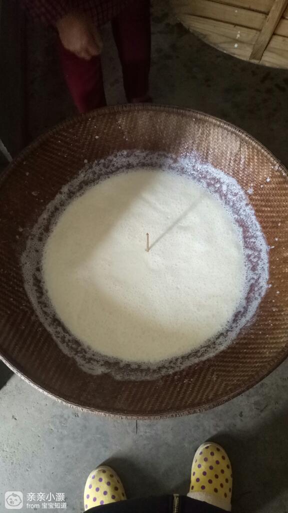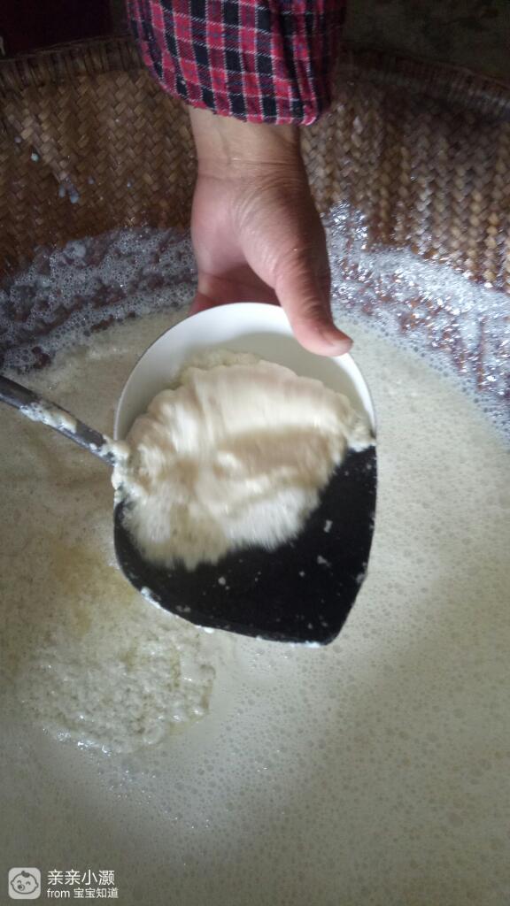锅里的豆浆煮好后,立刻起锅倒入准备好的容器里面,这个容易是用竹子编织而成的,我也不知道怎么称呼它,土话叫“尖锅盖”,哈哈,然后放入调和好的石膏粉,当筷子插入稳稳当当不倒的时候,说明豆腐制作成功!大家都送了一口气,这代表着好的新年预兆。