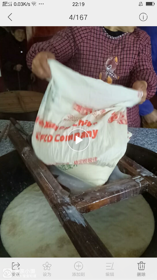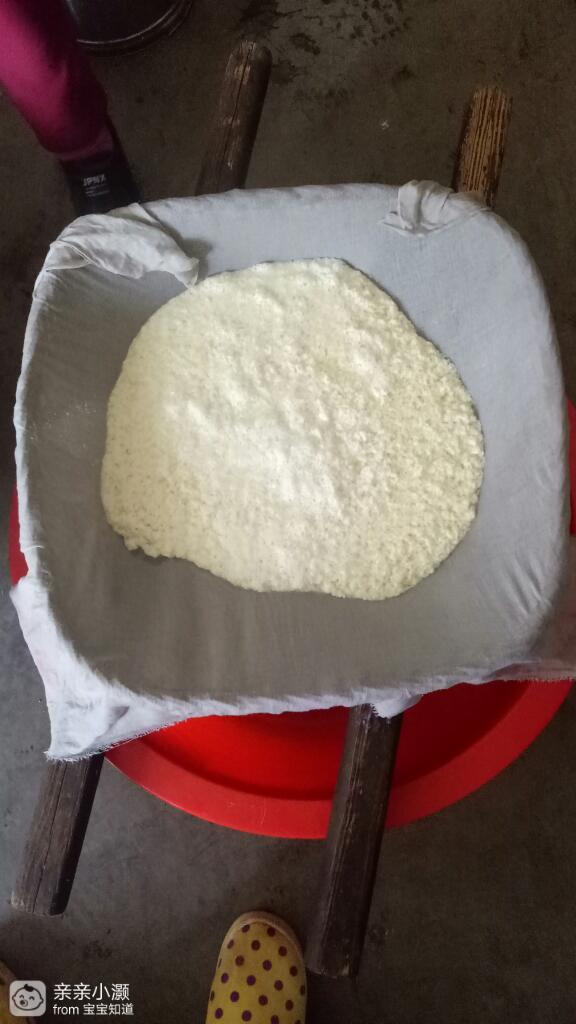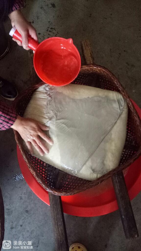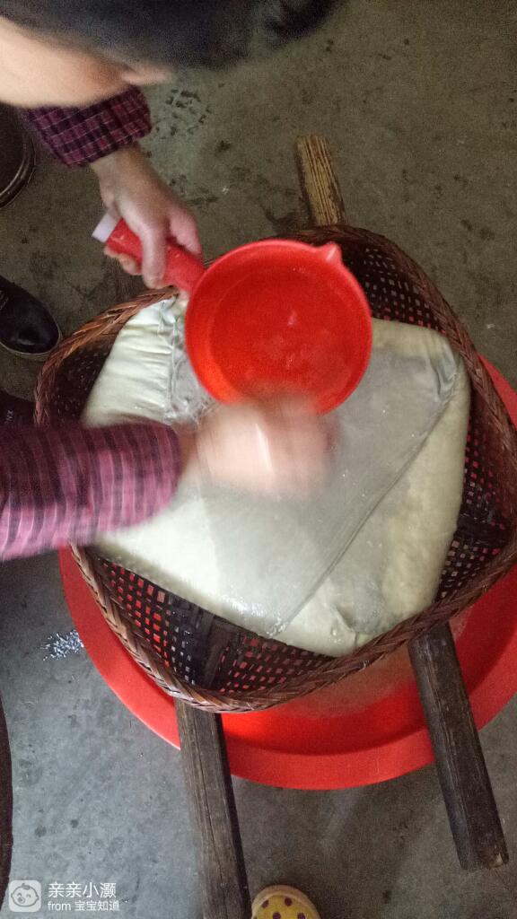 最后就是把豆腐包起来啦!从这个“尖锅盖”里面盛起来倒入铺好包片的四四方方的竹篮里面包起来。拍点凉水在上面,等待豆腐冷却。