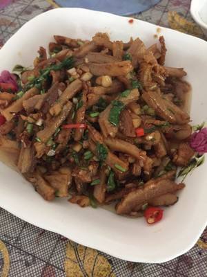 往锅里加油,放入盐大蒜辣椒哑某,炒香了,把卤好的牛肚切丝放进去一起炒!最后加香菜一起炒,加些酱油和蚝油.就完成了!