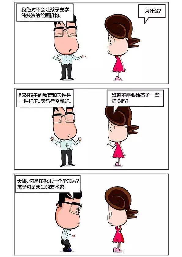 下面的这幅漫画是一个典型案例,爸爸鼓励孩子放飞自我,让孩子随心所欲地画,以为这样就是为他们插上了想象力的翅膀。