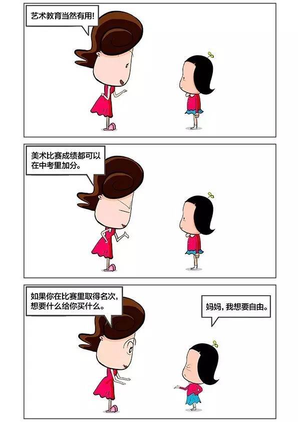 如同下面这几幅漫画里所描述的景象,一些过于功利的父母,想通过让孩子接受技法上的学习,在绘画比赛中取得名次,以此作为进入名校的加分项。
