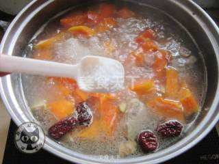 4 加入木瓜、红枣,水开后調入适量盐、鸡精,煮至木瓜熟透狼筝即可惠露。