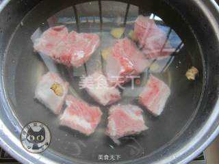 3 汤锅加水,下沙拉油、排骨、生姜煮开,撇去浮沫后在煮上10分钟