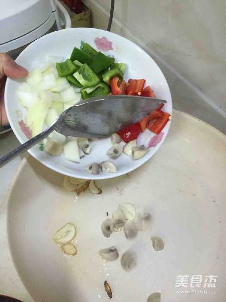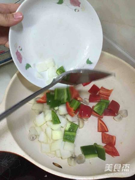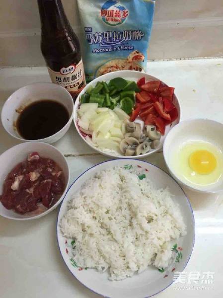 黑椒牛肉粒焗饭的做法 1. 准备好材料 青、红灯笼椒切粒 白洋葱切粒 白蘑菇切粒 鸡蛋一个或两个 黑椒汁加水混合 牛肉粒腌渍好