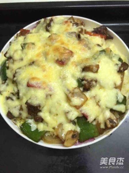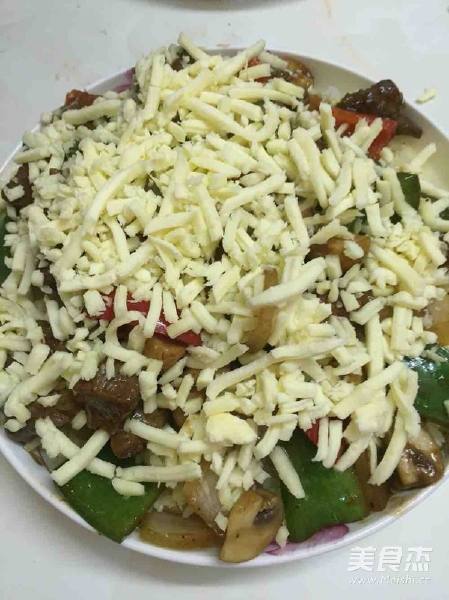 11. 炒好的黑椒牛肉粒装到饭上 撒上芝士