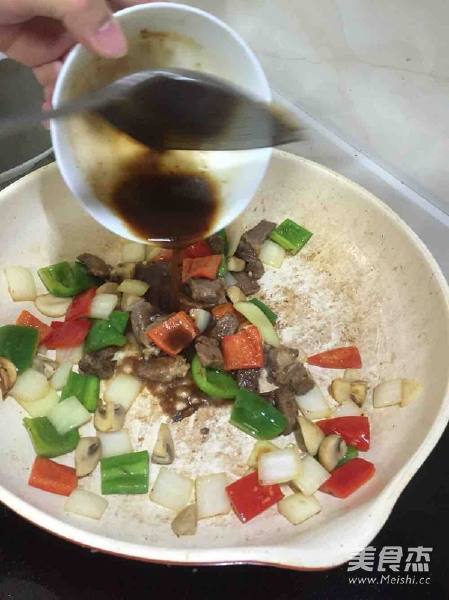 6. 将提前腌制好的牛肉粒稍微炒香上色 带焦 加入少许黑胡椒汁翻炒均匀 备用